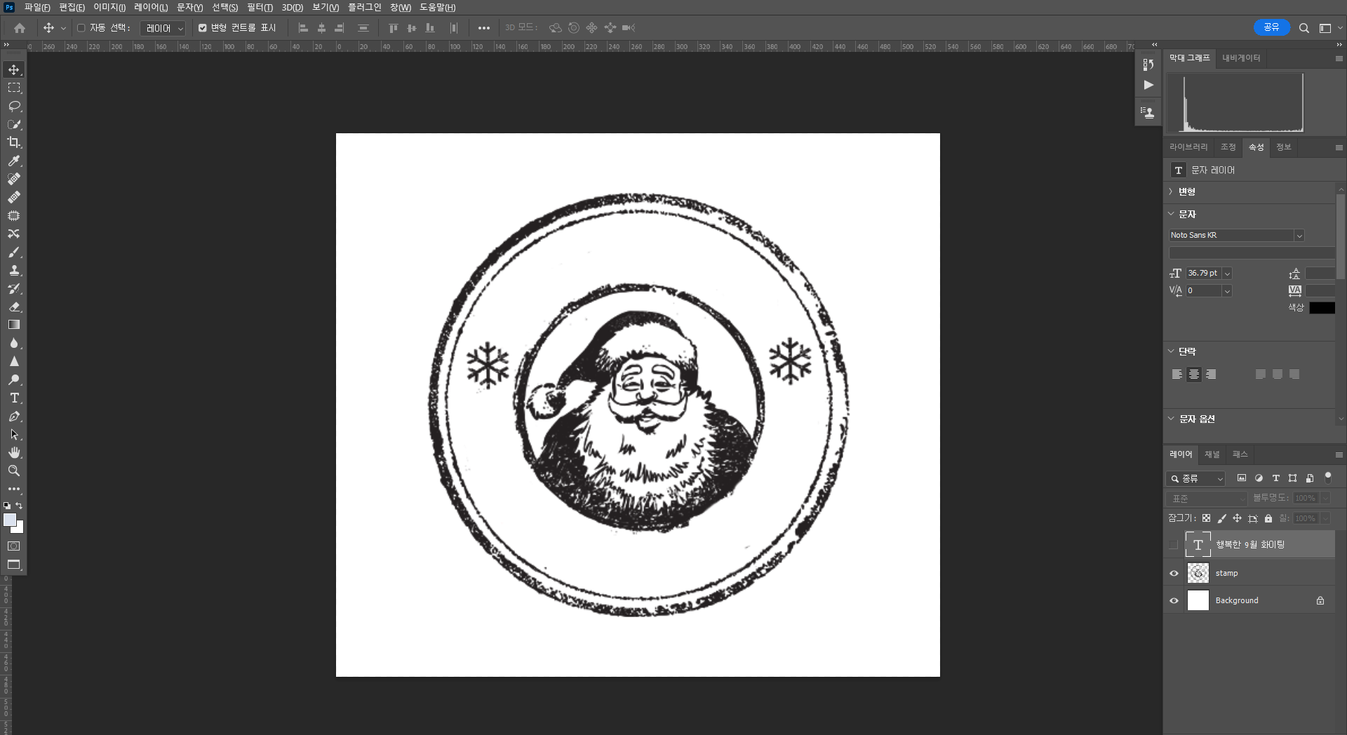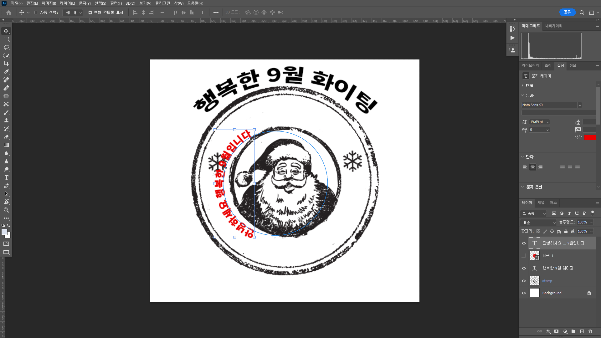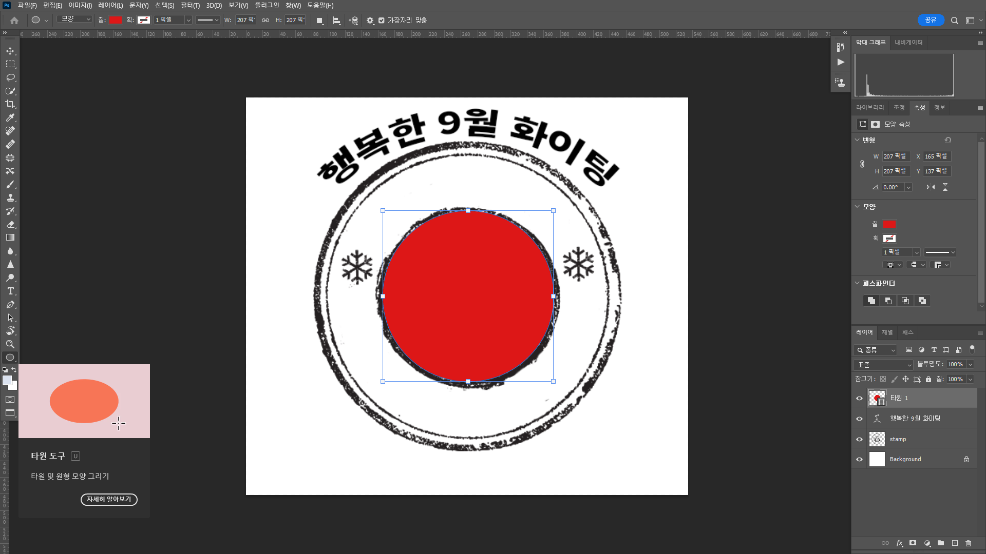 원 모양 이미지를 준비한다. 그 위에 텍스트 툴을 선택하여 적당한 위치에 글자를 작성한다.