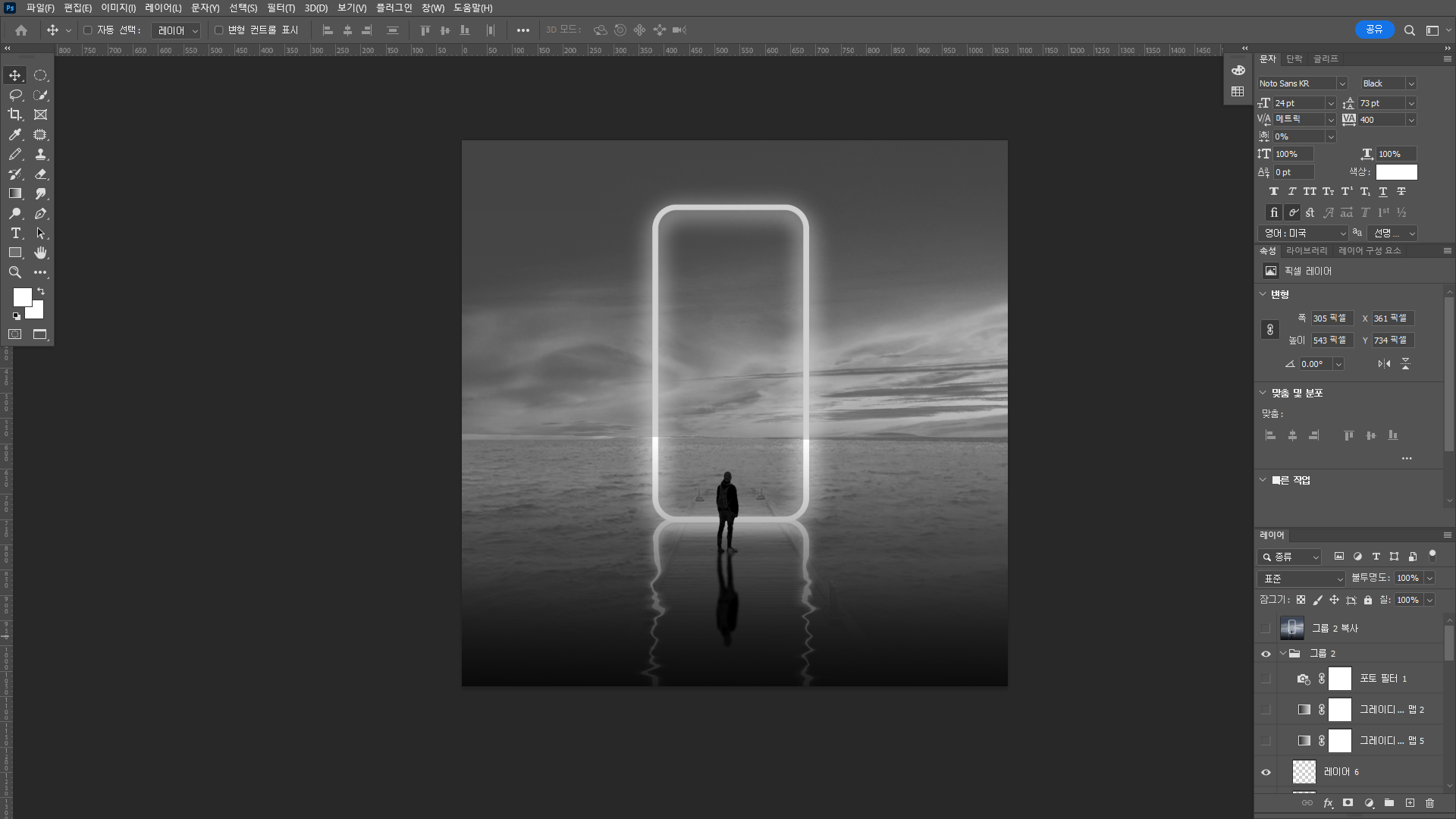 사람이미지도 어둡게 처리하여 그림자처럼 보이게 복사해서 수직뒤집기를 해준다.