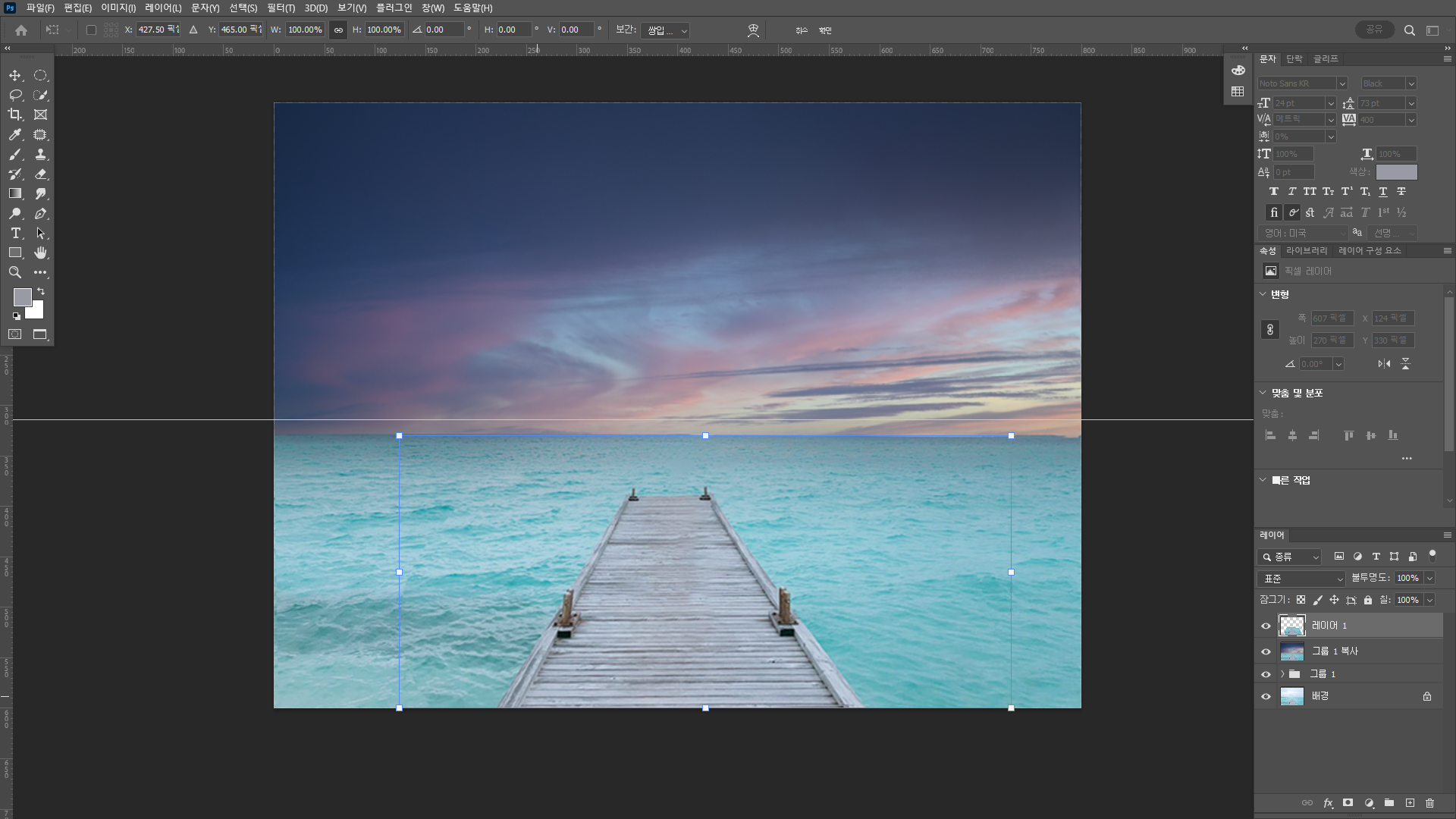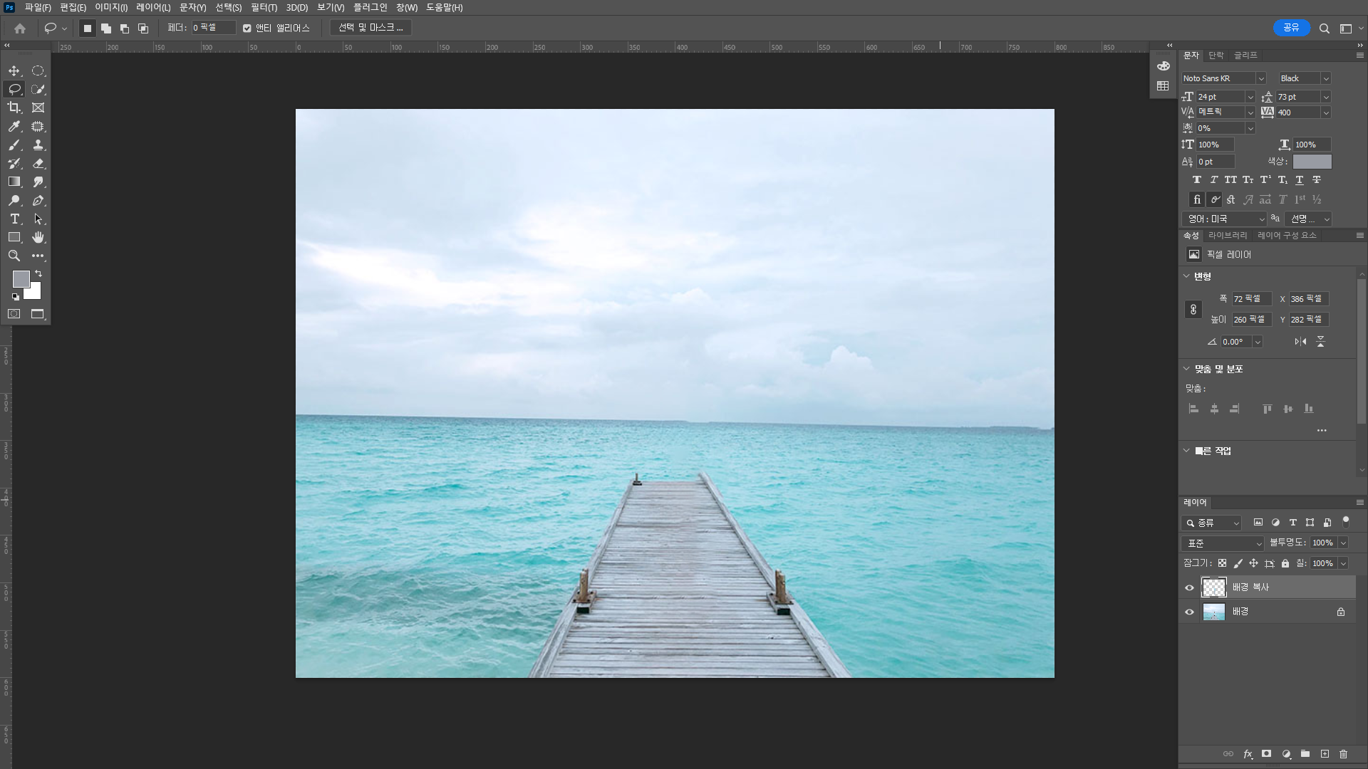 왼쪽 다리 끝부분을 따서 오른쪽으로 붙여준다. 수평 뒤집기를 했다.
